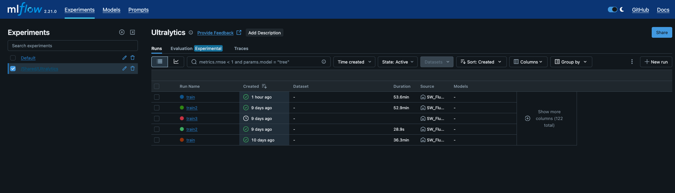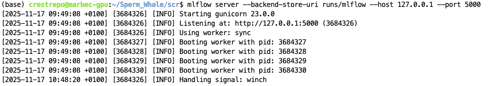 https://marbec-gpu.ird.fr/user/crestrepo/proxy/5000/Open the MLflow URL in your preferred web browser. You will be automatically redirected to the MLflow Experiments dashboard, where you can view and monitor all your runs and training sessions.